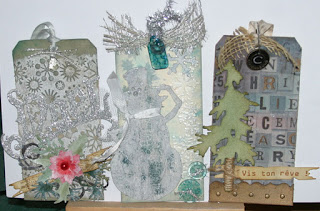 OK, I'm on a roll now! I've actually finished tag 7 too but haven't got the light to photograph that one and I've got to prepare the studio table for tonight's scrap class!So here are 2 rather unusual tags: #5 with its alcohol ink and plastic background has a rather clean & simple look. Tag 6 is metallic card, embossed, painted, sanded, inked and embossed with clear powder. You really need to go to Tim's blog to see the techniques explained - and his great tags of course - and you can believe him that you need to do the technique on tag 6 to see how good it is and that photos cannot do it justice!